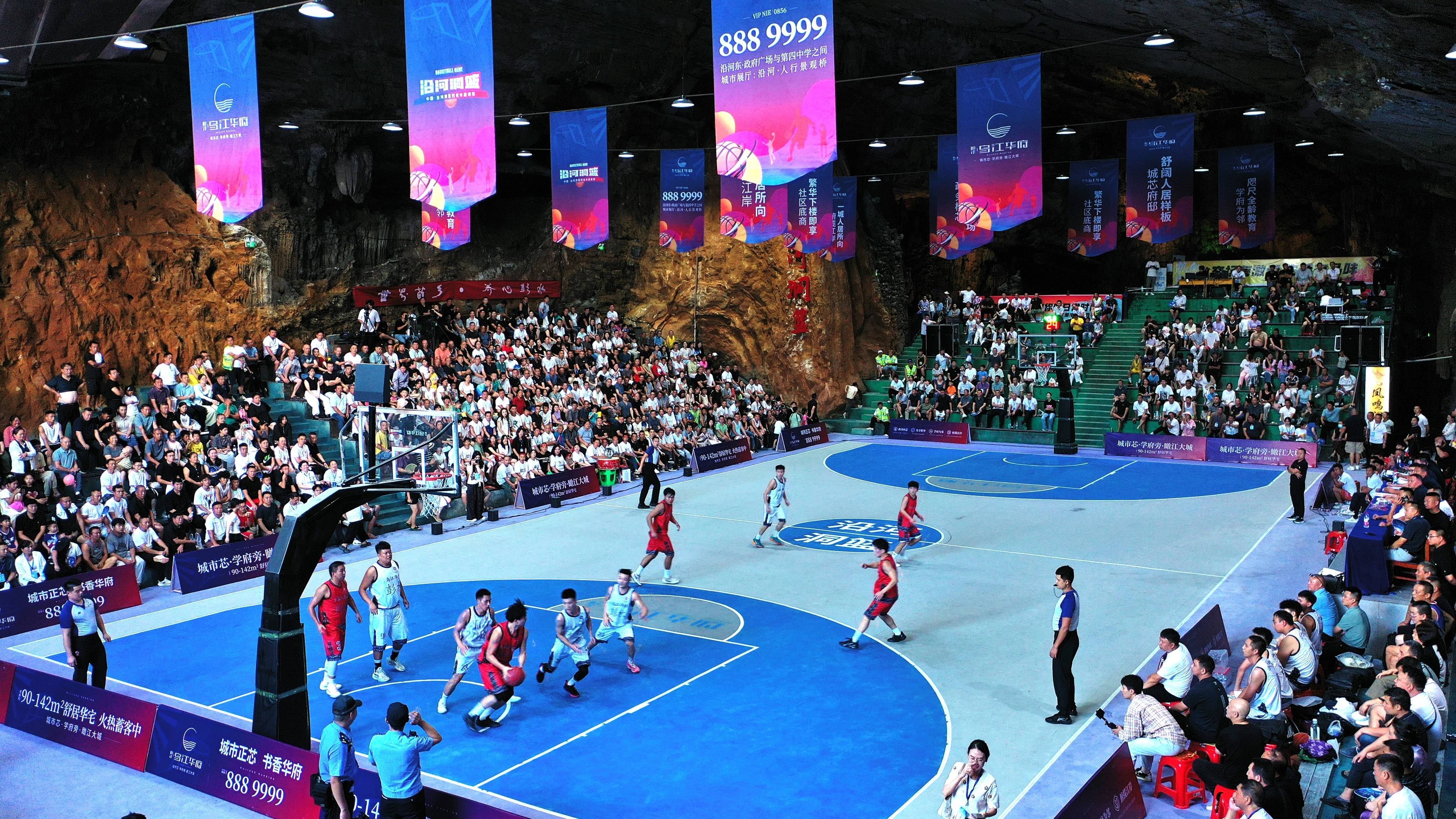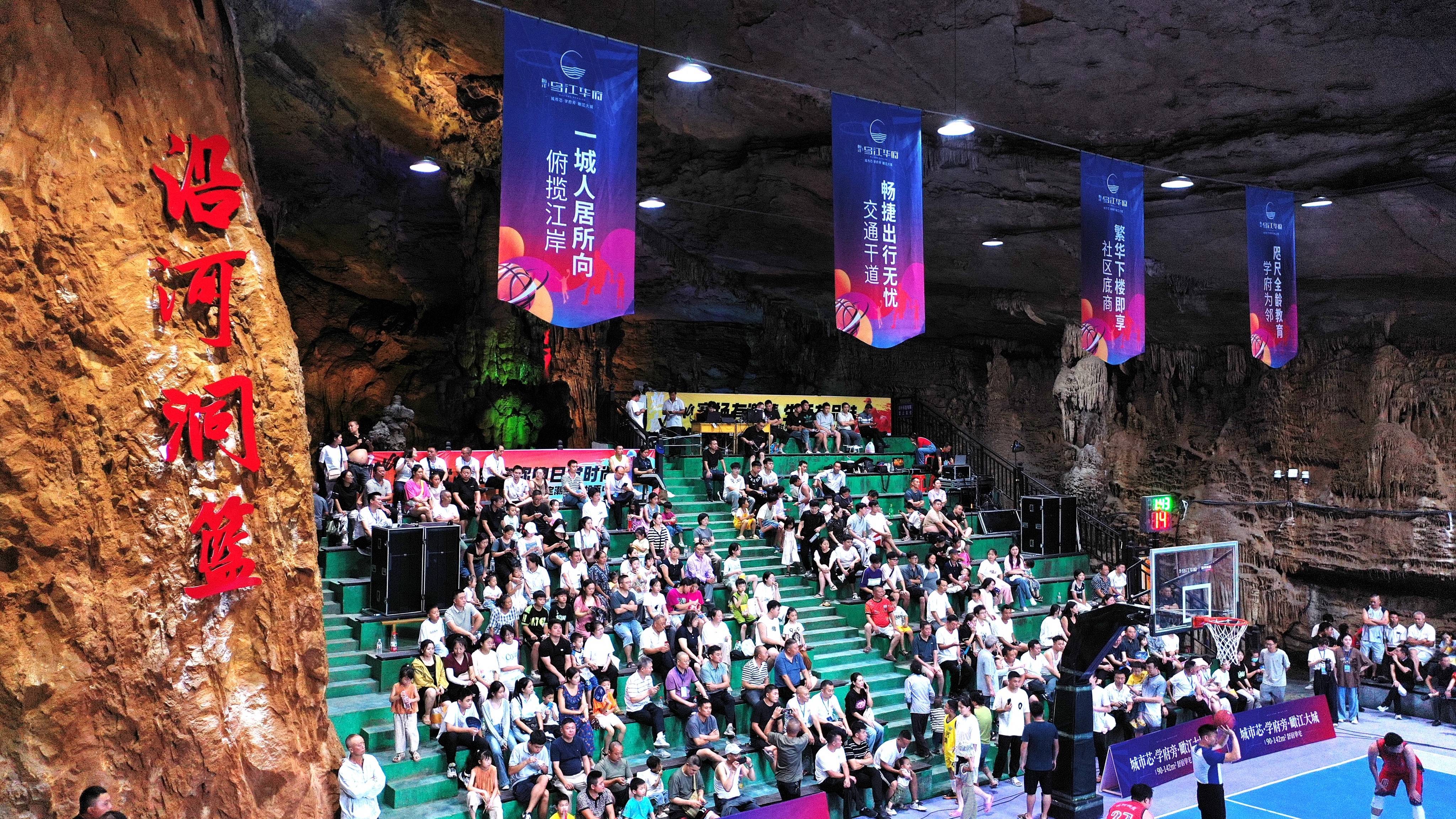“加油!加油!”抵达凤鸣洞前,耳畔传来的是解说员和观众的助威声。记者从洞口处可以看到,洞顶布满了高悬的彩带和洒下亮光的一排排大灯,正中间的篮球场上选手们正在激烈对抗,四面的看台坐满了观众。